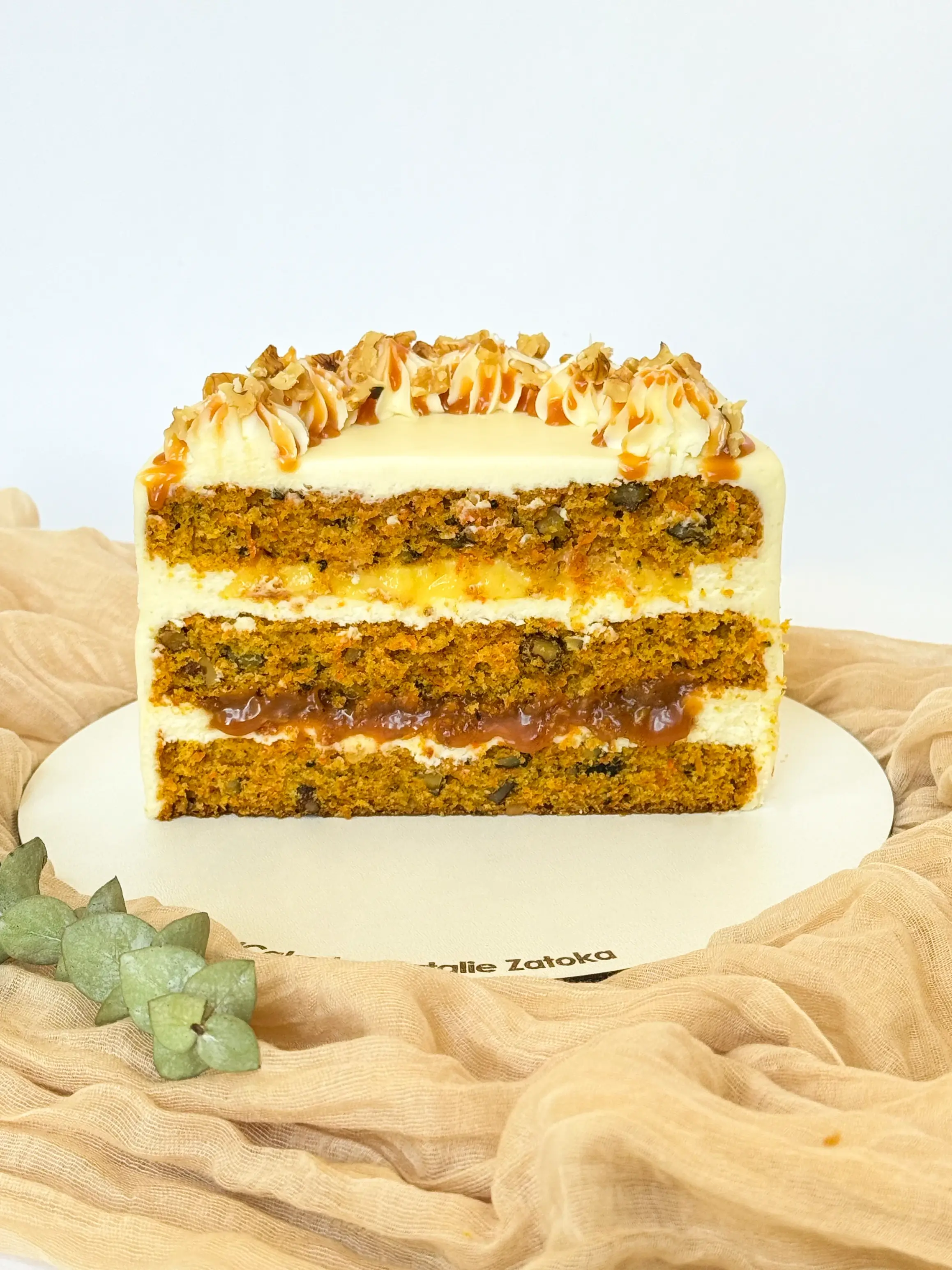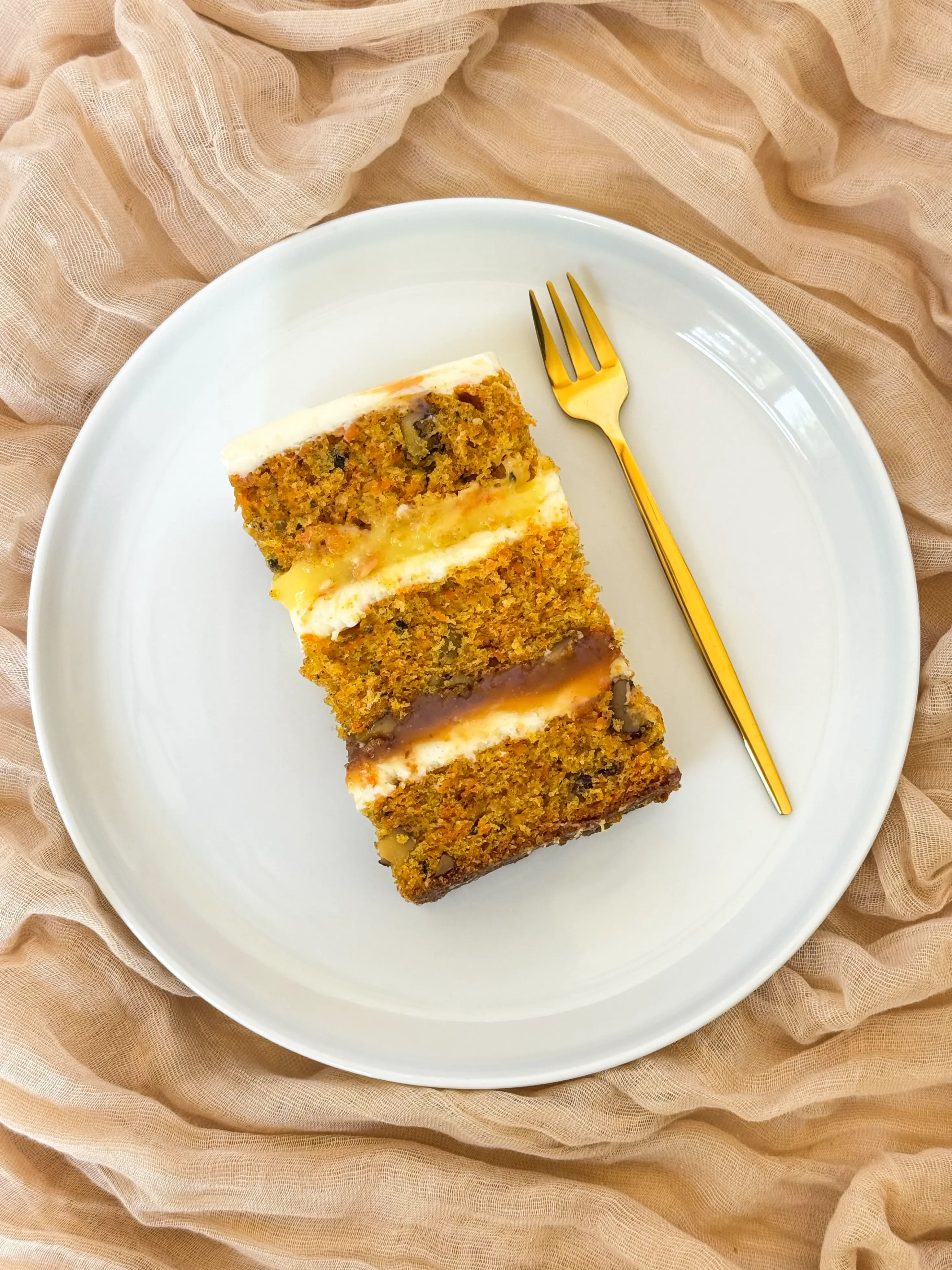 Moist, rich, and delightfully spiced, our gluten-free carrot cake is a timeless favorite. It's made with hand peeled and grated carrots, cinnamon, and a hint of nutmeg - each bite packed with flavor and texture. A smooth cream cheese frosting perfectly complements its natural sweetness. What makes our carrot cake extra special are the two delicious fillings: homemade salted caramel and bright orange curd. Whether you’re celebrating a special occasion or simply indulging in a cozy dessert, this cake delivers comfort and charm in every slice.