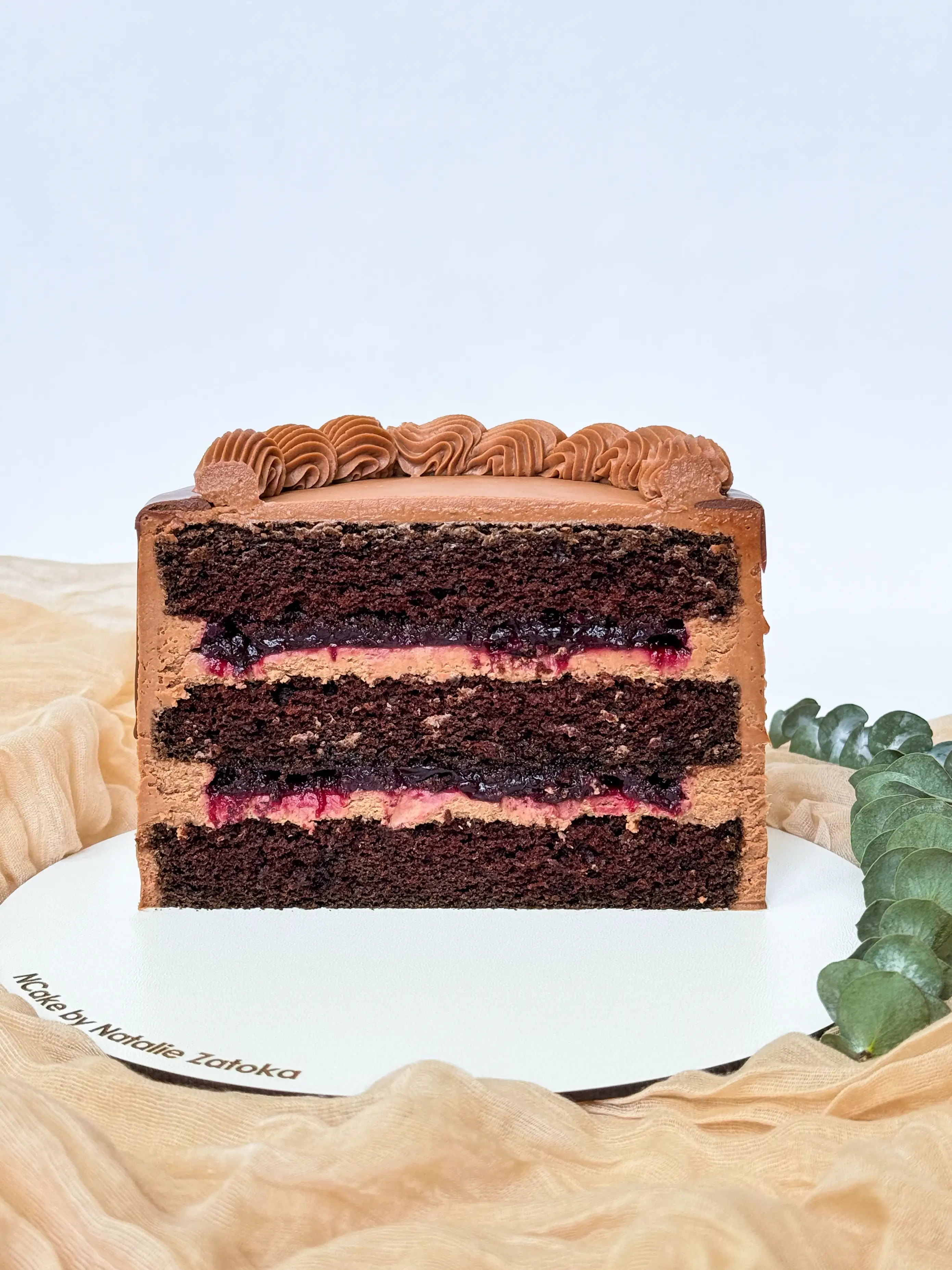 This indulgent gluten-free cake features rich, moist chocolate sponge layers that melt in your mouth with every bite. Between each layer, a luscious dark cherry confit adds a burst of tart sweetness. The chocolate cream cheese frosting is made with fine Callebaut Belgian chocolate. The combination of dark cherry and chocolate creates a decadent, slightly fruity contrast, making each slice a beautifully balanced dessert.