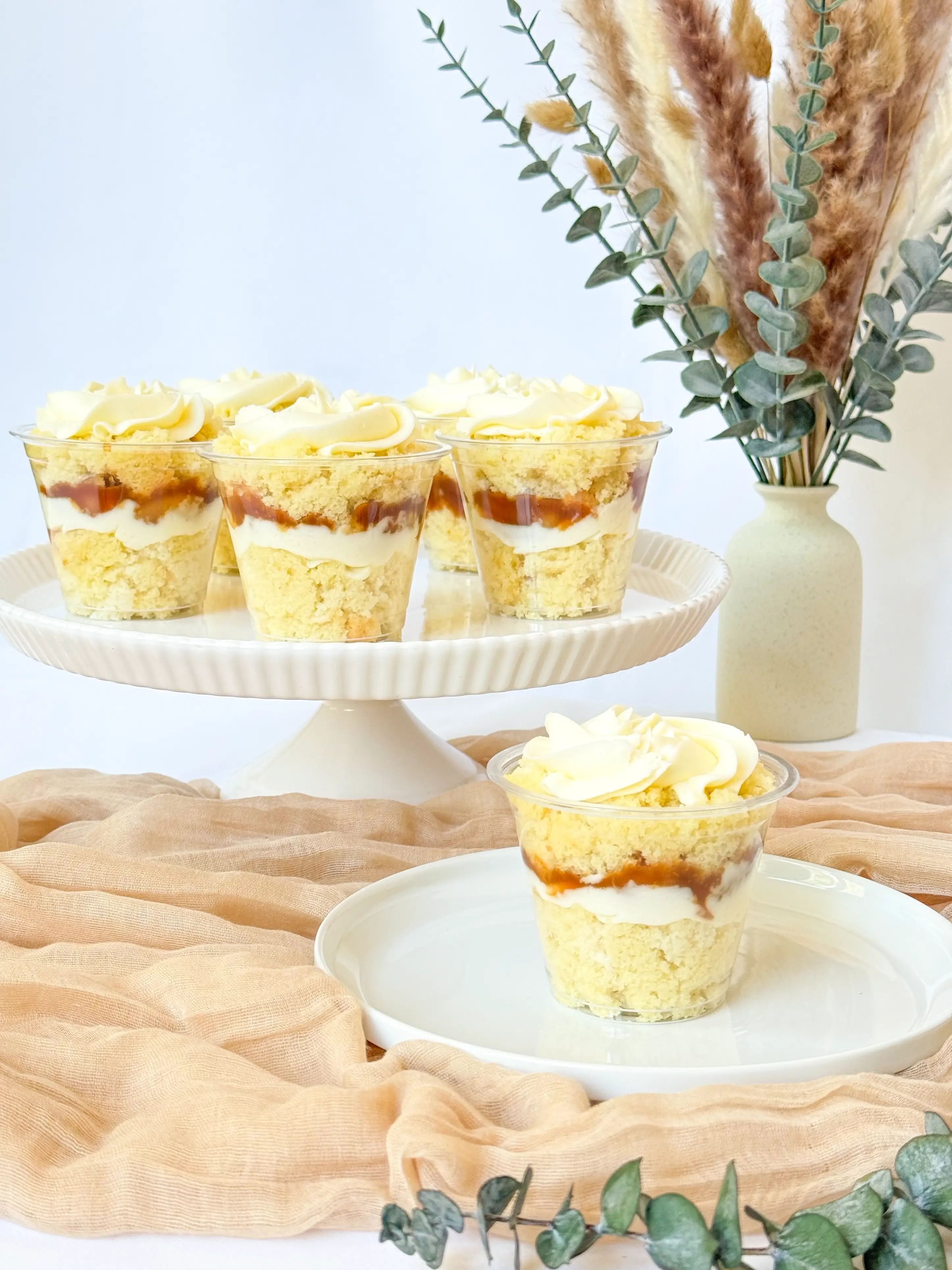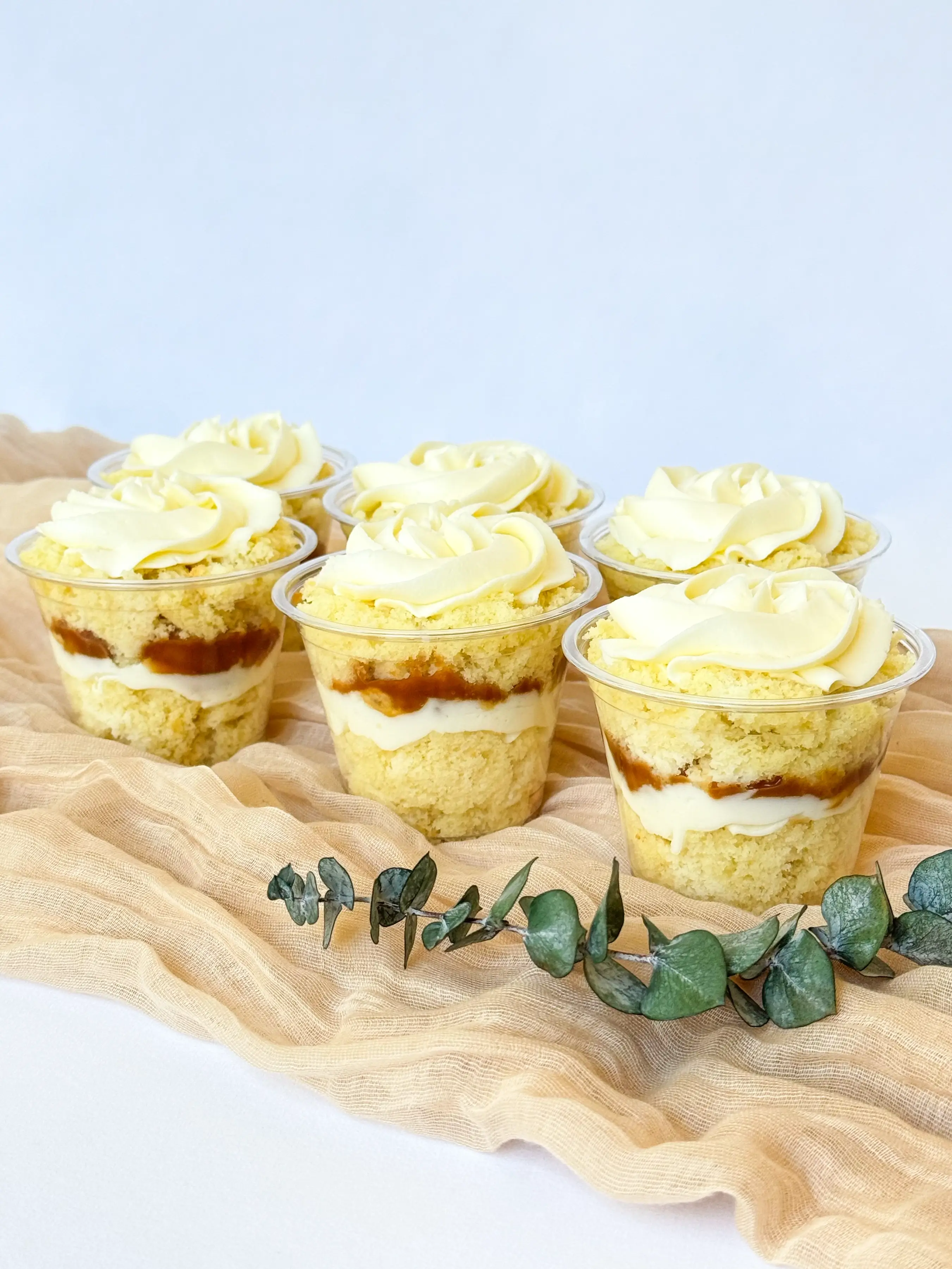 Treat yourself to a caramel banana trifle. Moist pieces of vanilla cake alternate with caramel-braised bananas and a smooth, creamy cream cheese frosting, creating a perfect harmony of flavors and textures. Our trifles are a convenient treat — individually portioned, ready to enjoy anytime, with perfect layers of cake, cream, and filling in every cup.