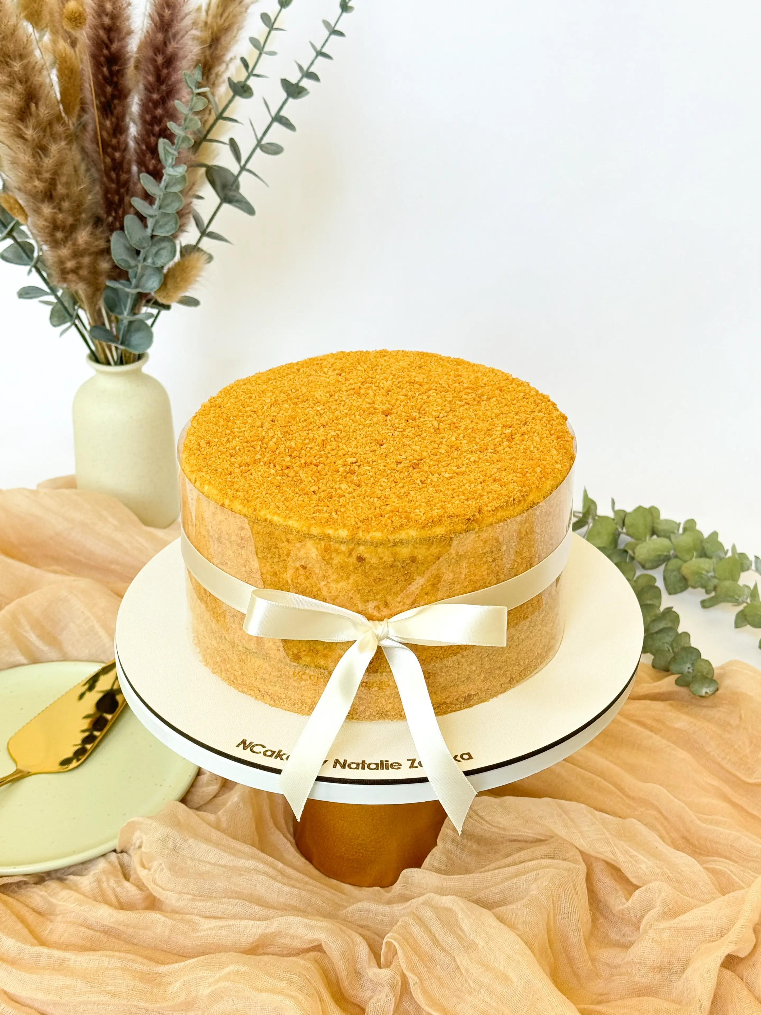 Our signature cake, and a beloved classic from Ukrainian heritage. This honey cake features eight thin layers of soft, honey based sponge — each one carefully rolled out by hand. Filled with a light cream based on sour cream and just the right touch of sweetness, it offers deep honey notes and a tender, balanced taste. Made entirely from scratch, this handmade dessert is a tribute to tradition, true flavor, and simple, honest ingredients.