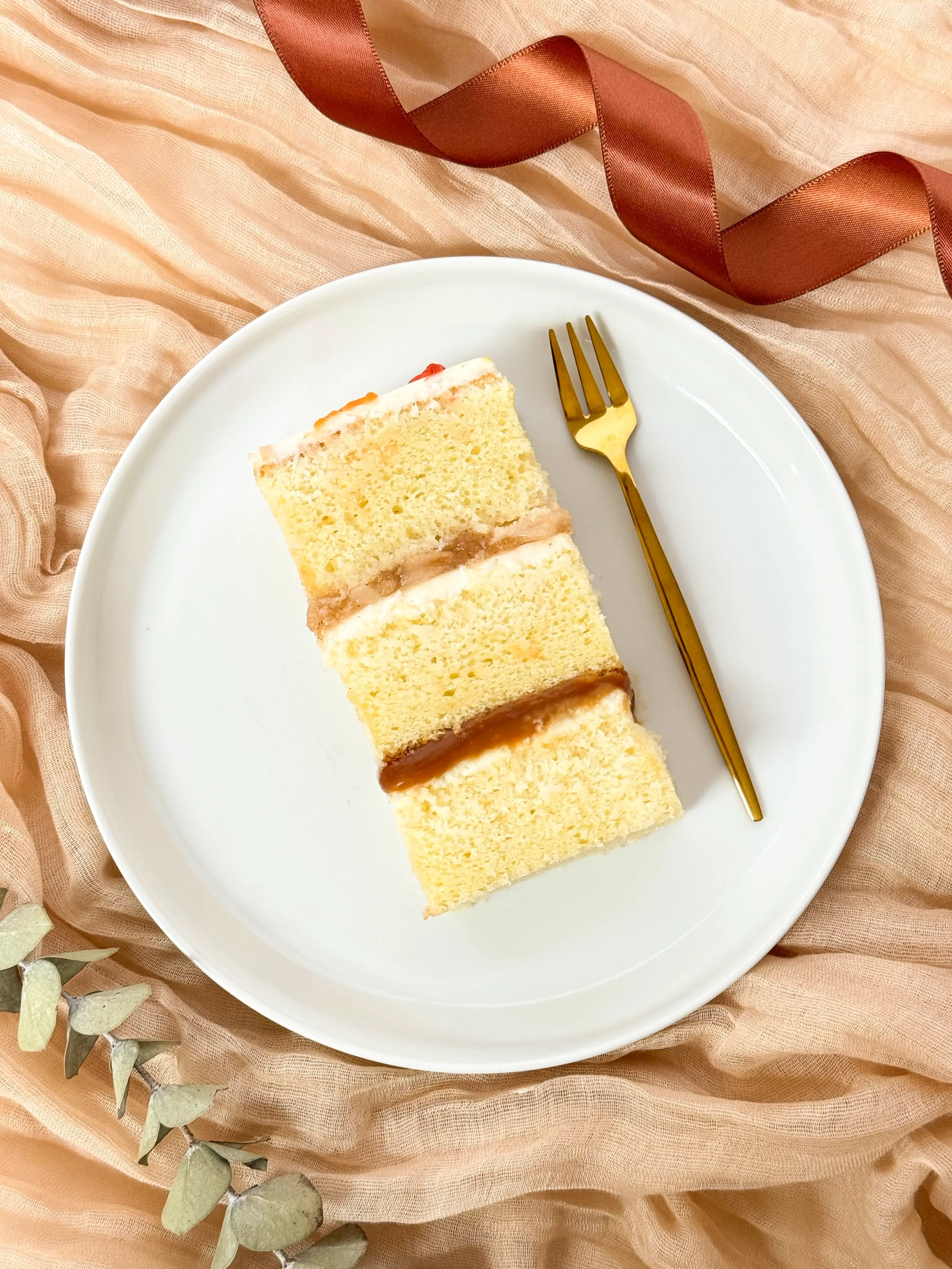 Thanksgiving is a time for family to gather together. It's a warm and cozy time, filled with delicious food and lots of joy. Our Spiced Pear themed cake is a perfect addition to your holiday table as a dessert to delight the whole family. Vanilla sponges are paired with homemade caramel and a pear filling flavored with cinnamon and nutmeg.